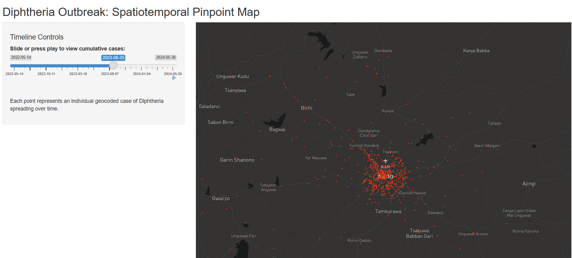 Spatial analytics for real-time geocoding of the Diphtheria outbreak in Kano, Nigeria, facilitating targeted resource allocation.